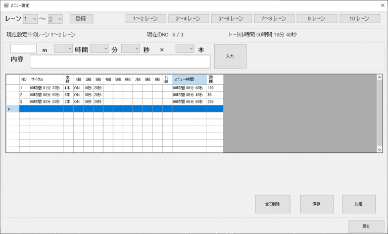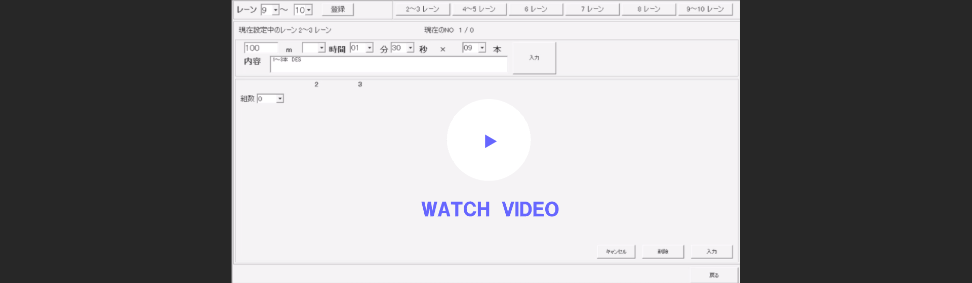 (※2:対応レーンは10レーンですが、同時に行えるメニューは最大6つになります。(例:10レーンのプール(1~10レーン)で、1,2レーンは(メニュー①)3,4レーンは(メニュー②)5,6レーンは(メニュー③)7,8レーンは(メニュー④)9レーンは(メニュー⑤)10レーンは(メニュー⑥)といったように6つのメニューを同時に行う事ができます。)