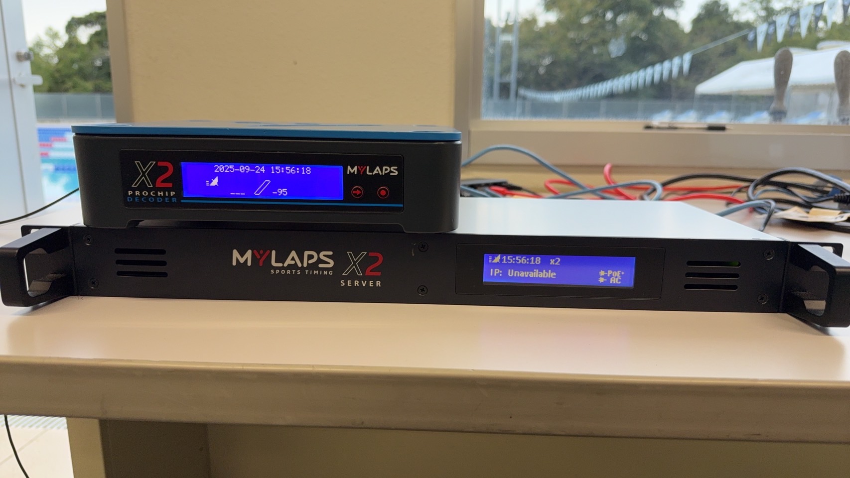 Mylaps機器からのループ線が設置されたプールのレーンをトランスポンダ―といわれるチップをキャップの中やゴーグルのゴムに着けて泳ぐことにより、ターンや、タッチ毎にタイムを計測する事ができます。